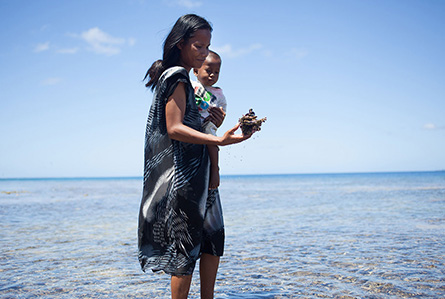 Mores war das erste Baby, das nach den Atomtests auf Eniwetok geboren wurde. Wenige Tage nach der Rückkehr seiner Eltern kam er 1980 in jenem Haus zur Welt, in das seine Familie jetzt zurückkehrt. Mit dem Anbau, in dem Mores' Schwester früher eine Billardhalle und ein Ramen-Restaurant betrieben hat, ist es immer noch eines der größten Häuser der Insel. Der Beton bröckelt und das Dach ist undicht, aber Brooke hat mit Geduld und blauer Wandfarbe ein gemütliches Heim für ihre Familie geschaffen. Sie trägt ein traditionelles Guam, wie alle Frauen hier. Verwandte und Nachbarn gehen ein und aus, tratschen, essen, trinken.